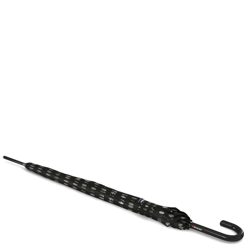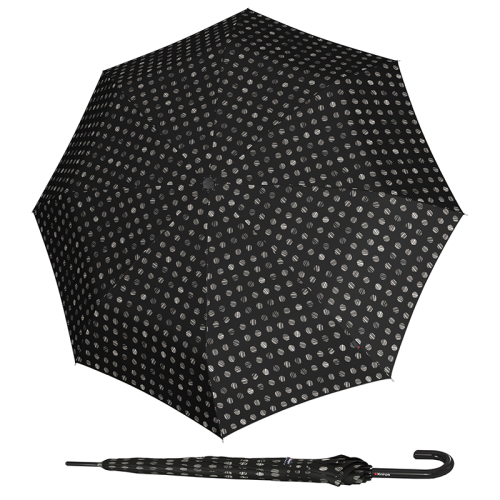 Deze Knirps paraplu komt uit diens A.760 Stick Automatic collectie en heeft de kleur zwart. Het frame is eveneens zwart. Het gekromde handvat maakt het gemakkelijk om de paraplu op te hangen. Er is een automatische opening en de uiteinden van elke balein heeft een beschermnop.