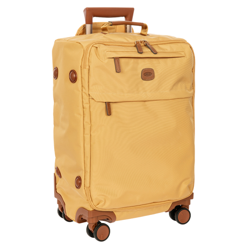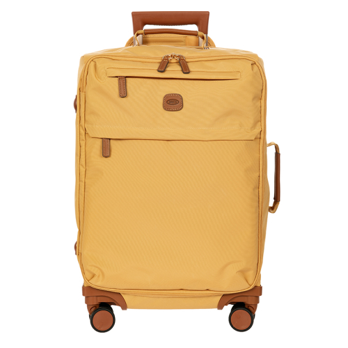 De Brics XCollection in het geel is een lichte, zachte handbagagekoffer, die gemaakt is van gerecycled polyamide. De koffer heeft een klassieke uitstraling door de lederen details en goudkleurige hardware.