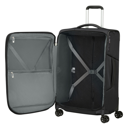 De voorzijde van de koffer beschikt over twee ruime ritsvakken, ideaal voor spullen die je snel bij de hand wil hebben. De binnenzijde bestaat uit twee compartimenten. Het linker compartiment is in diepte uit te breiden doormiddel van de rits die rondom de koffer loopt. Het rechter compartiment is een stuk dieper waardoor je hier perfect al je kleding een plaats kan geven. Beide compartimenten beschikken over inpakriemen, hierdoor blijven al je spullen netjes op de plaats. Tot slot heeft de binnenzijde ook nog een extra ritsvak, geschikt voor je kleinste spullen. De koffer heeft een volume van 82 tot 92 liter en een gemiddeld inpakgewicht van ongeveer 15 kg.
