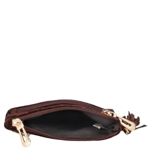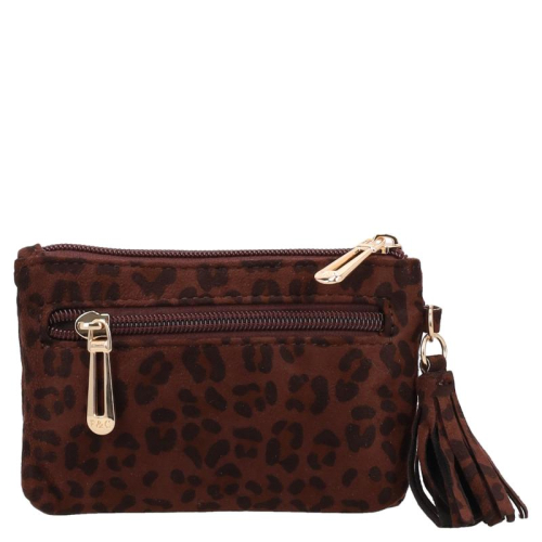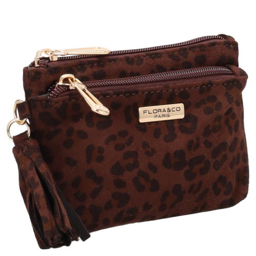 De Flora & Co Dania is een portemonnee in chocoladebruin met zwarte panterprintvlekjes, uitgevoerd in een zachte stof voor een aaibare uitstraling. De goudkleurige hardware geeft het geheel een chique uitstraling. Aan de zijkant hangt een speels kwastje in dezelfde print als de portemonnee.