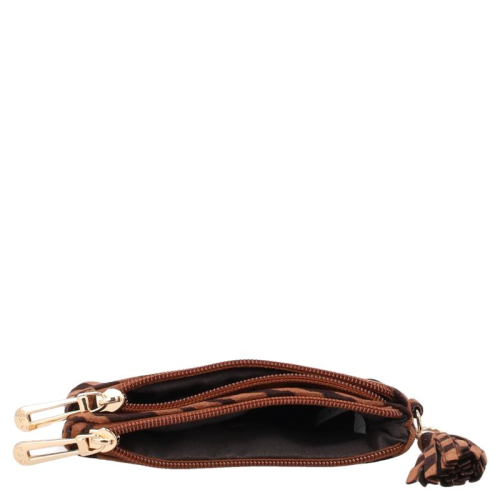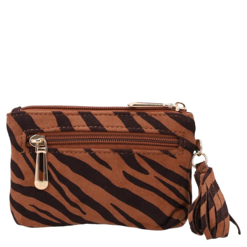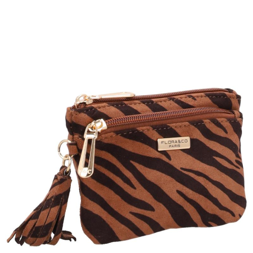 De Flora & Co Dania is een portemonnee in cuive met zwarte zebraprint, uitgevoerd in een zachte stof voor een aaibare uitstraling. De goudkleurige hardware geeft het geheel een chique uitstraling. Aan de zijkant hangt een speels kwastje in dezelfde print als de portemonnee.