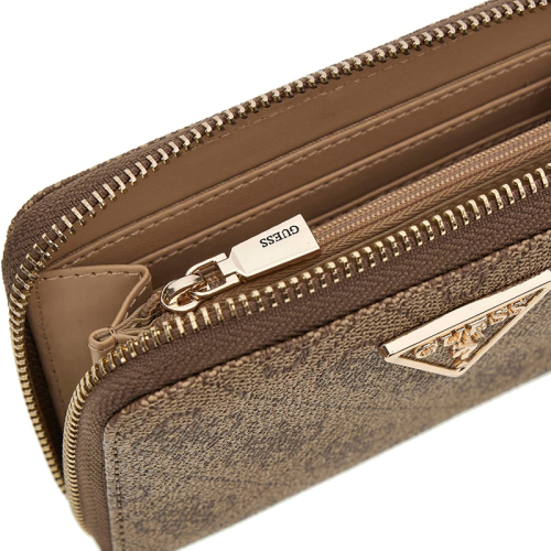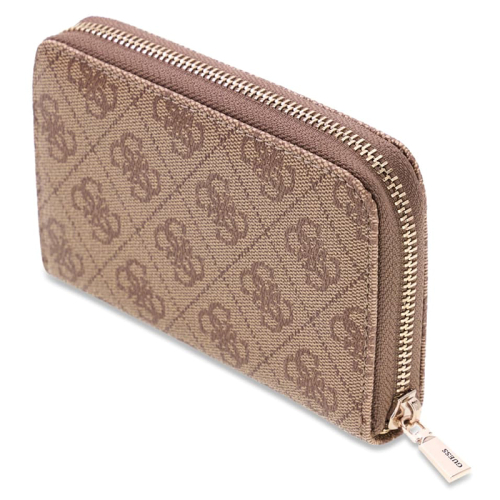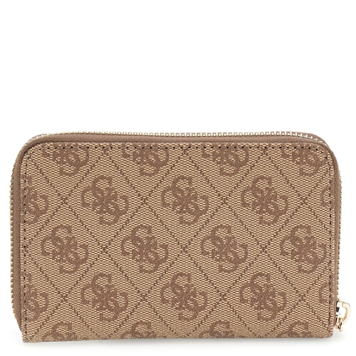 De Guess Laurel || portemonnee in een warme bruine logoprint straalt luxe en elegantie uit. Met praktische opbergvakken en goudkleurige hardware is dit een ideale combinatie van stijl en functionaliteit.