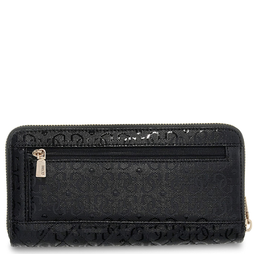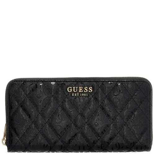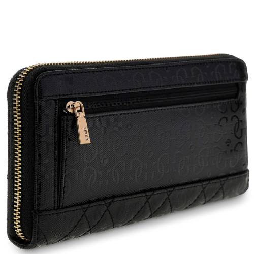 De Guess Isemay portemonnee is een elegante verschijning in klassiek zwart. Het ontwerp wordt verrijkt met goudkleurige hardware en een subtiel geëmbosseerd logo. Over de portemonnee loopt een glanzend zwart logo, wat zorgt voor een luxe uitstraling.