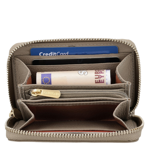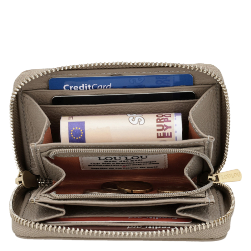 Klein maar fijn! Deze taupe leren portemonnee van Loulou Essentiels, collectie Petite Emilie is gemaakt van mooi generfd leer, vervaardigd in een BCSI gecertificeerd atelier met hart voor mens en milieu. Aan de voorzijde vind je een klein steekvakje, terwijl een ritsvakje aan de achterzijde ideaal is voor je muntgeld.