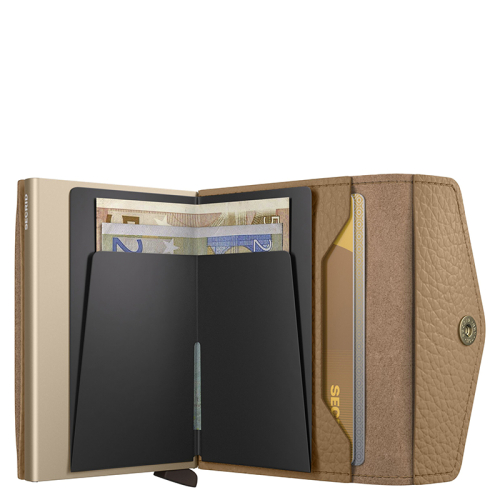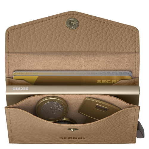 Ontdek de Secrid Envelope Wallet Pebble in getextureerd bruin leer, jouw stijlvolle en functionele metgezel voor elke gelegenheid. Met zijn goudkleurige accenten en innovatieve design ben je verzekerd van een geweldige mix van elegantie en gemak!