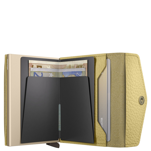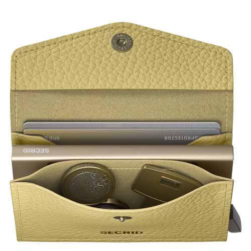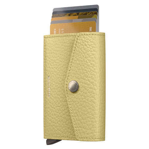 Ontdek de Secrid Envelope Wallet Pebble in getextureerd botergeel leer, jouw stijlvolle en functionele metgezel voor elke gelegenheid. Met zijn goudkleurige accenten en innovatieve design ben je verzekerd van een geweldige mix van elegantie en gemak!
