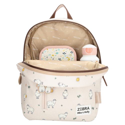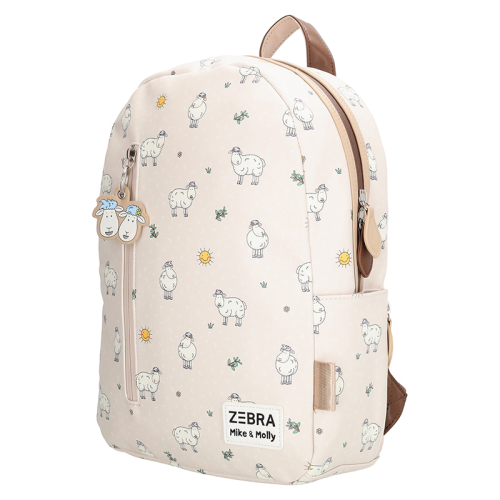 De Zebra Trends Mike & Molly rugzak is dé perfecte metgezel voor jonge avonturiers die elke dag iets nieuws ontdekken. In een zachte beige tint met een speels patroon waarin het schaapjesduo centraal staat, zorgt deze tas direct voor een vrolijke start van elke schooldag en elk uitstapje.