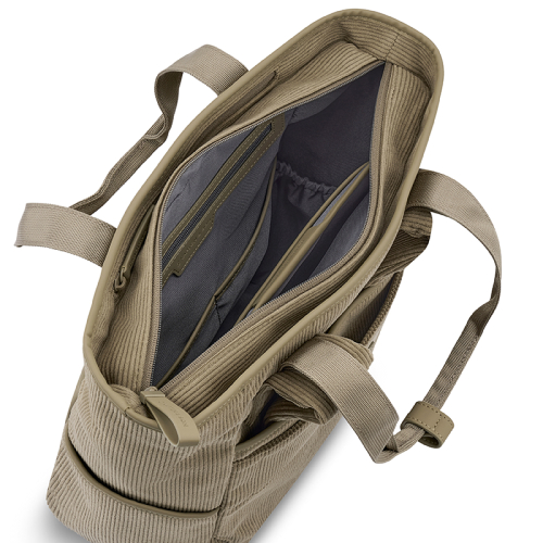 Binnenin biedt de Lindby Cord een slim ingedeeld hoofdcompartiment dat opent met een ritssluiting. Je vindt er een apart ritsvak, twee steekvakken geschikt voor een drinkfles of paraplu, en drie extra steekvakken voor kleinere accessoires zoals een telefoon, sleutels of notitieboekje. Daarnaast is er een gevoerd laptopvak dat geschikt is voor laptops tot 14 inch