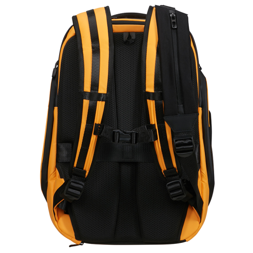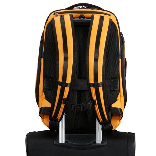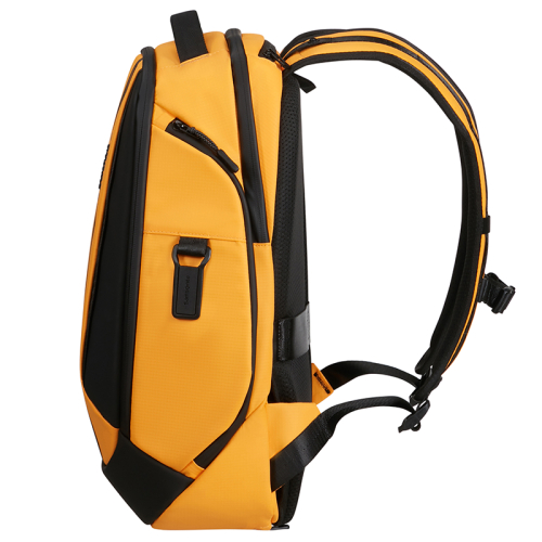 De Samsonite Active Road laptoprugzak is uitgevoerd in geel met zwartkleurige hardware. De waterafstotende gecoate stof biedt extra bescherming tegen regen en vuil.