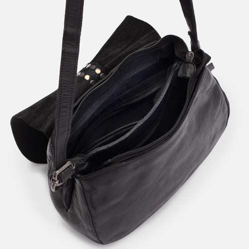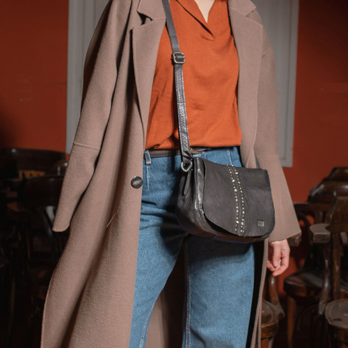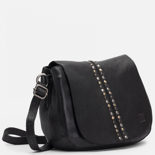 De Hancock van Biba is een uitgesproken tas met karakter. Uitgevoerd in zwart leer en afgewerkt me een mix van goud-, zilver- en zwartkleurige hardware, is deze tas allesbehalve standaard. De studs op de klep, in de verschillende tinten, geven het ontwerp een edgy en speelse uitstraling.