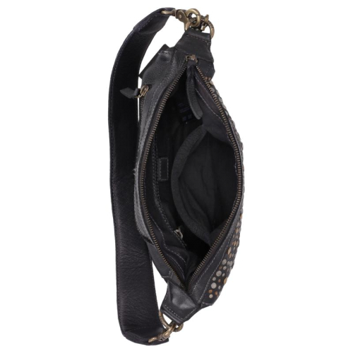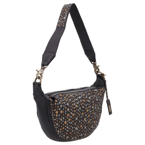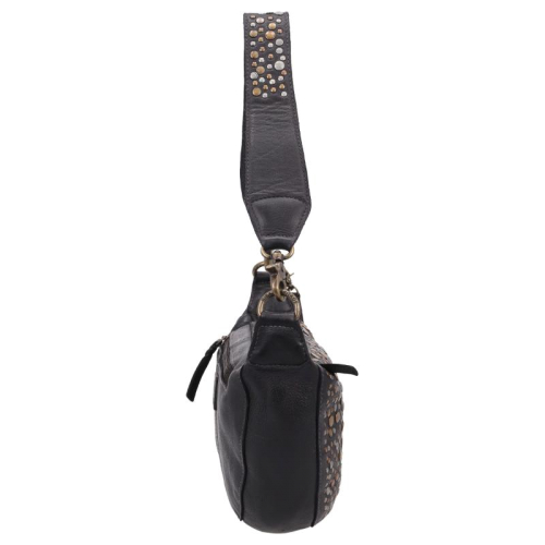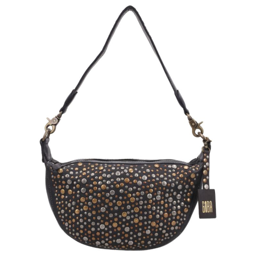 De Lovington Stars van Biba is een speelse en stijlvolle tas die opvalt door haar unieke details. Uitgevoerd in zwart leer en afgewerkt met een mix van goud- en zilverkleurige hardware, straalt deze tas karakter uit. De goudkleurige rits en accenten zorgen voor een warme, luxe uitstraling, terwijl de zilverkleurige studs een edgy contrast toevoegen.