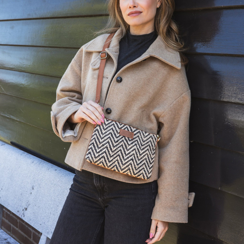 Draag de Romio Jaquard als stijlvolle clutch in de hand of gebruik de afneembare en verstelbare leren schouderband om haar comfortabel als schoudertas of crossbody te dragen. Zo pas je de tas moeiteloos aan je look en gelegenheid aan.