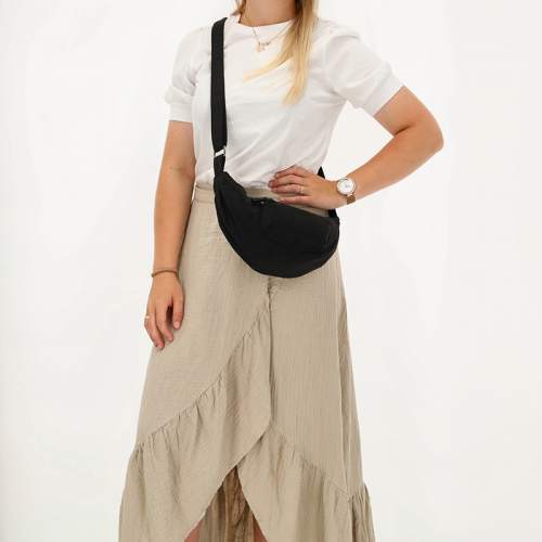 De Charm London Valley is een zwarte crossbodytas gemaakt van duurzaam nylon met een elegante halve maanvorm. Het geribde design in combinatie met zilverkleurige hardware geeft de tas een stijlvolle uitstraling. Perfect als zowel schoudertas als crossbody, dankzij de verstelbare band.