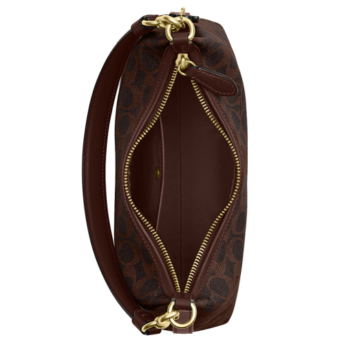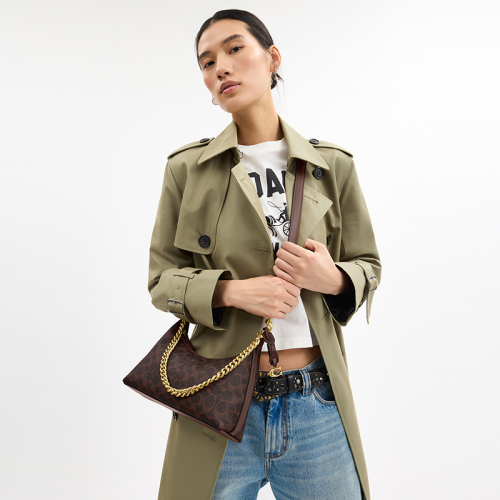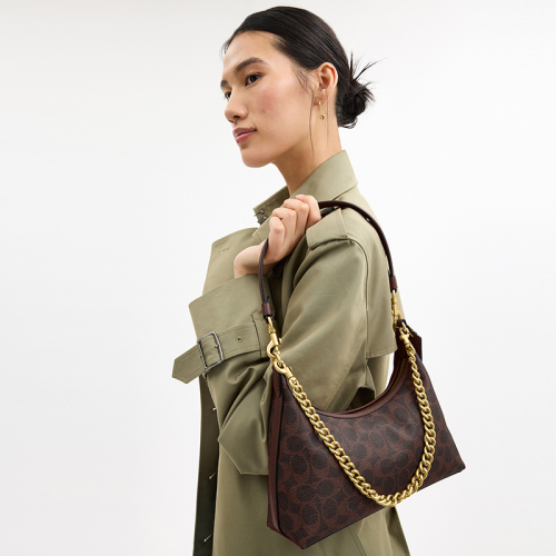 Deze tas straalt elegantie uit met zijn bruine signature Jacquard, die stijlvol en chic combineert. De bruine kleur met goudkleurige hardware vormen een echt fashion statement. De bagcharm met de herkenbare C maakt de tas helemaal af.