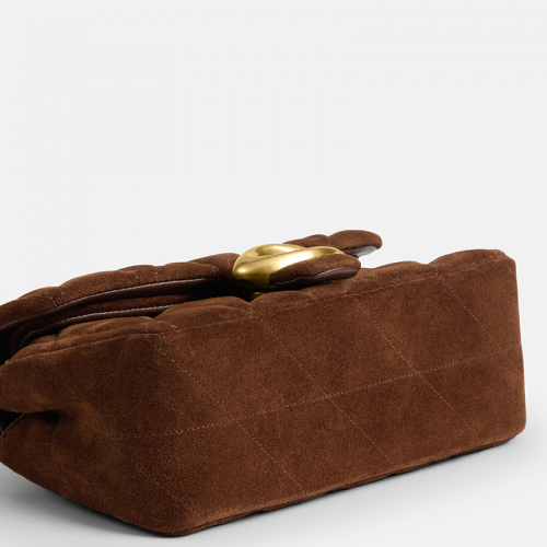 Deze schoonheid van een tas, de Coach Quilted Tabby 20, is een lust voor het oog met zijn chique bruine suède en heerlijk zacht gewatteerd gestikt ruitpatroon. Het is een statement piece dat elegantie en stijl uitstraalt. Coach, een merk met roots in New York, is wereldwijd bekend om zijn luxe en tijdloze ontwerpen, en deze tas is daar een prachtig voorbeeld van. De goudkleurige hardware, inclusief het iconische C-logo van Coach op de voorkant, voegt een vleugje glamour toe. De stoere metalen chain schouderband maakt het helemaal af.