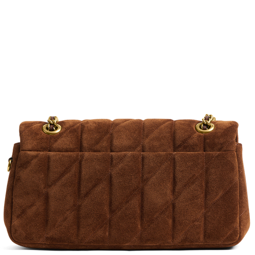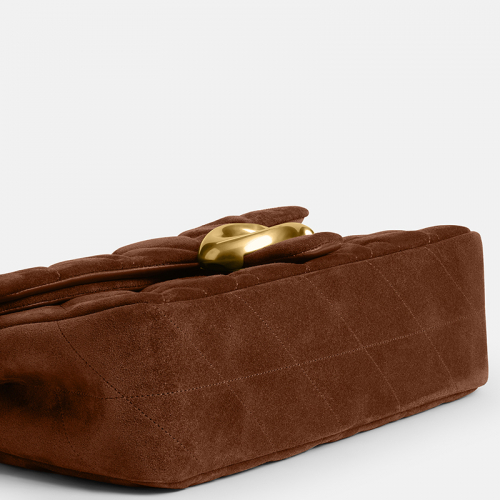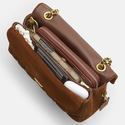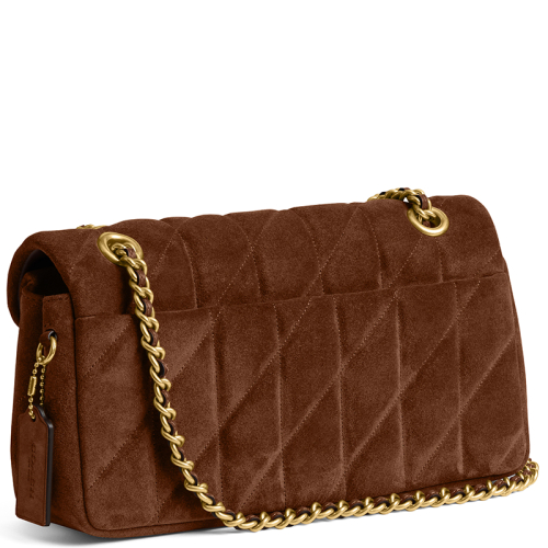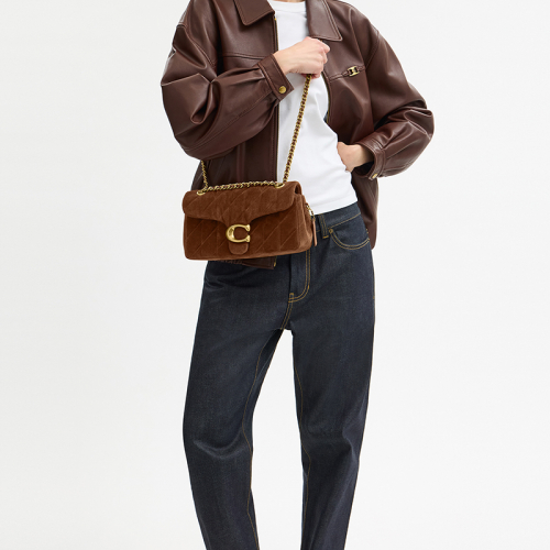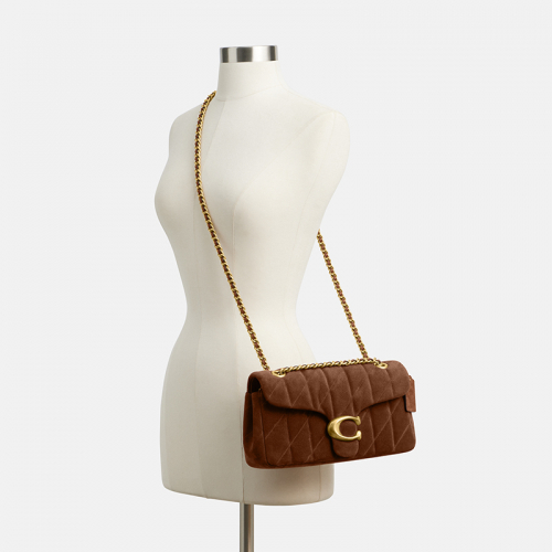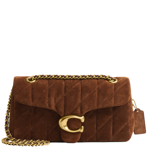 De Coach Quilted Tabby 26 is een elegante schoudertas uitgevoerd in bruin suède. De stiksels geven de tas een subtiele geruite structuur, terwijl de goudkleurige hardware zorgt voor een luxe uitstraling. Opvallend detail is de grote goudkleurige 'C' aan de voorkant, die niet alleen een eyecatcher is maar ook dient als sluiting van de klep.