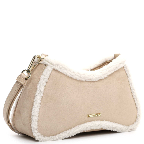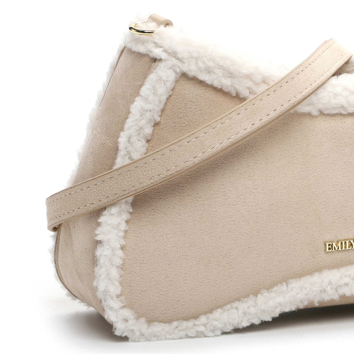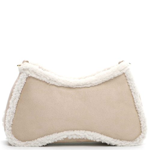 De tas heeft een elegante suède look, waarbij de naden zijn afgewerkt met een schapenvachtachtig randje voor een unieke, cosy uitstraling. De goudkleurige hardware voegt een verfijnd accent toe.