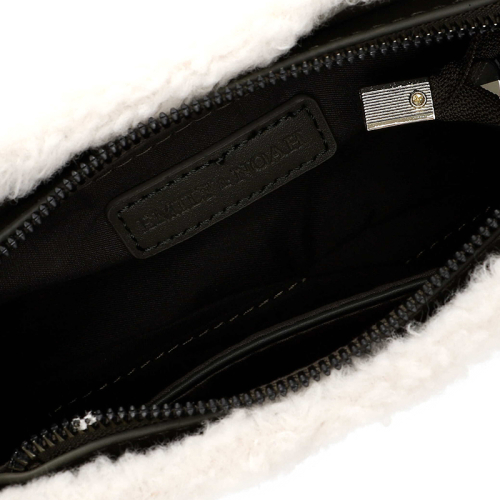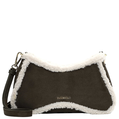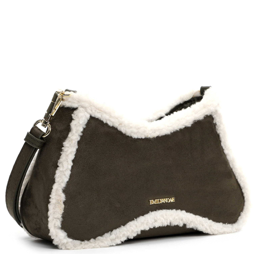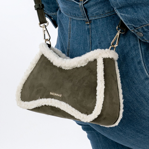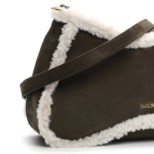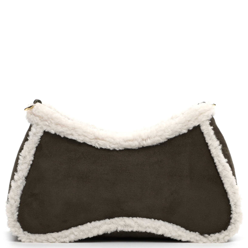 De tas heeft een elegante suède look, waarbij de naden zijn afgewerkt met een schapenvachtachtig randje voor een unieke, cosy uitstraling. De goudkleurige hardware voegt een verfijnd accent toe.