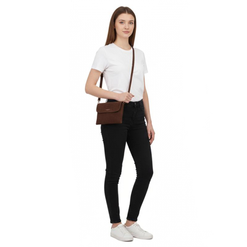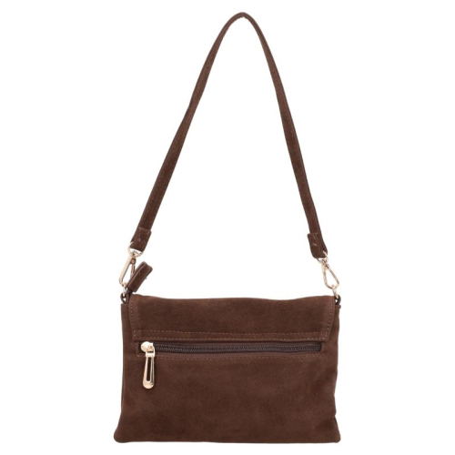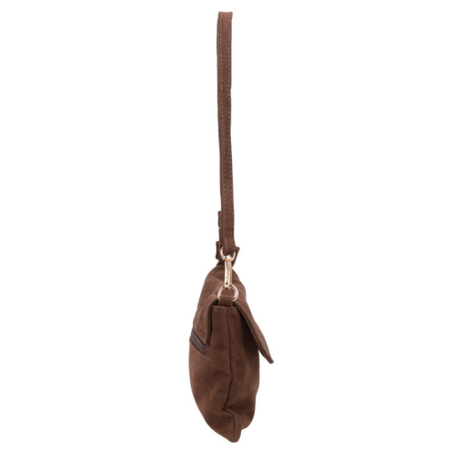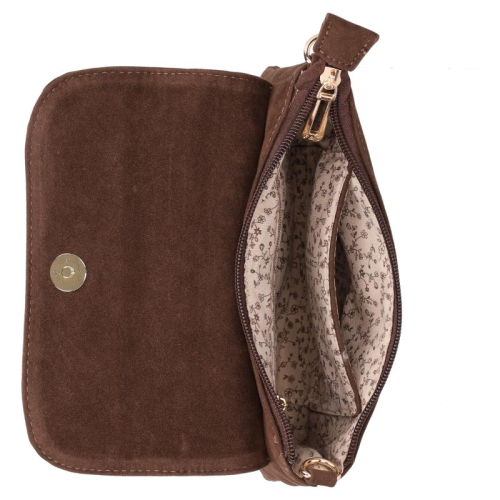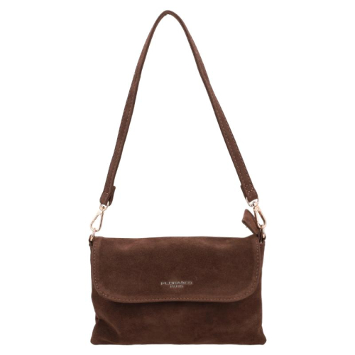 De Flora & Co Paloma is een elegante tas in bruin velvet, afgewerkt met goudkleurige hardware voor een luxe uitstraling. Aan de voorkant bevindt zich een stijlvol klepje met daarop het Flora & Co-logo in goudkleurige letters.
