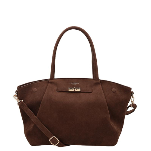 De Flora & Co Savannah is een elegante handtas uitgevoerd in bruinkleurig suède en afgewerkt met goudkleurige hardware. De opvallende buckle aan de voorkant geeft de tas een luxe en moderne uitstraling, waardoor dit model een echte eyecatcher is.