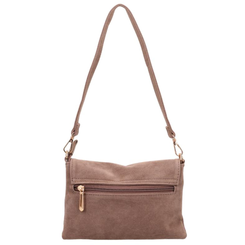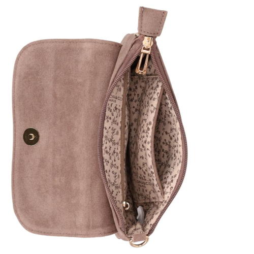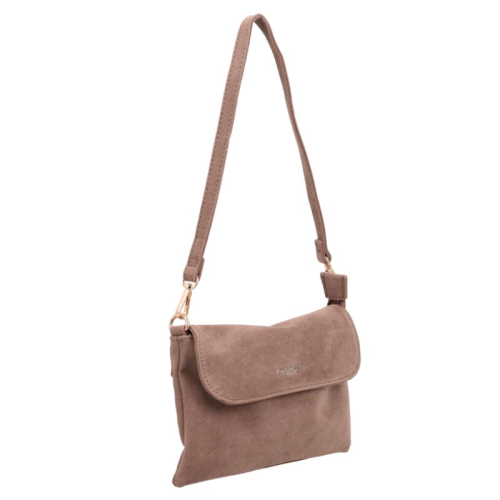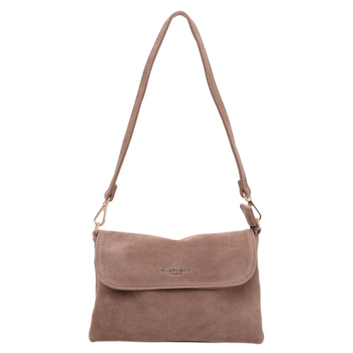 De Flora & Co Paloma is een elegante tas in taupe velvet, afgewerkt met goudkleurige hardware voor een luxe uitstraling. Aan de voorkant bevindt zich een stijlvol klepje met daarop het Flora & Co-logo in goudkleurige letters.