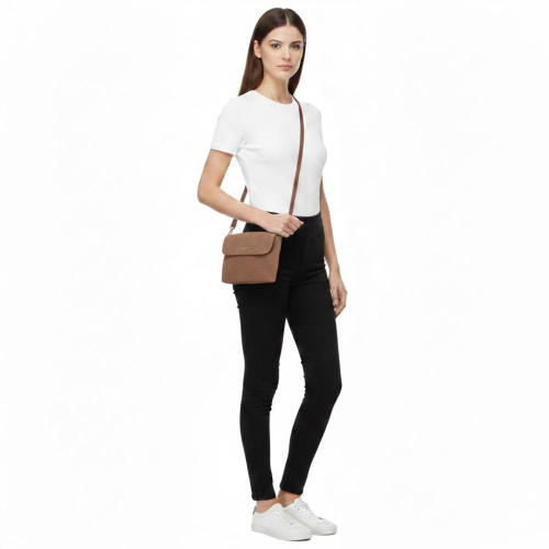 Aan de achterzijde vind je een handig ritsvak. Het hoofdcompartiment opent in twee stappen: eerst de klep met magnetische drukknoop, daarna de ritssluiting. Binnenin bevinden zich een ritsvak en een steekvak, ideaal voor het georganiseerd opbergen van je essentials.