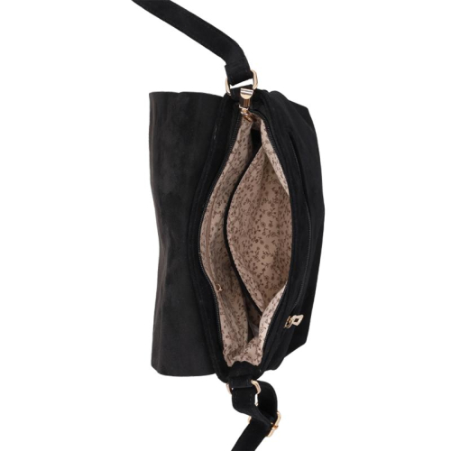 Stijlvol en elegant, dat is hoe je de Flora & Co Manon crossbodytas het beste kunt omschrijven. Deze tas is gemaakt van een zacht en sierlijk suède-look polyester in een prachtige zwarte tint die je outfit direct een chique uitstraling geeft. Het merk Flora & Co staat bekend om zijn verfijnde ontwerpen en hoogwaardige materialen, en deze tas is daarop geen uitzondering. Binnenin vind je een beige floraal patroon dat de tas een speels en vrouwelijk detail geeft. De goudkleurige hardware details en het subtiele merklogo op de klep maken het geheel helemaal af.