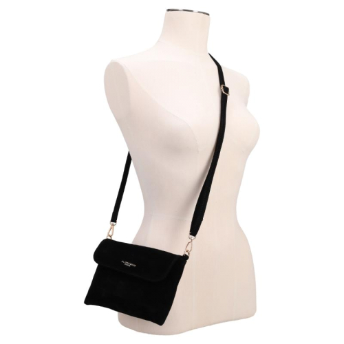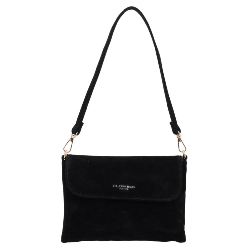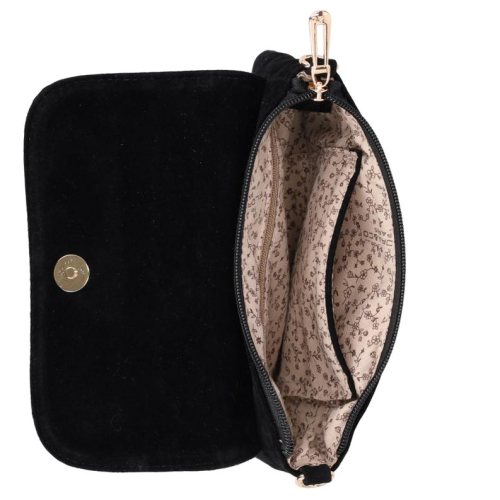 De Flora & Co Paloma is een elegante tas in zwart velvet, afgewerkt met goudkleurige hardware voor een luxe uitstraling. Aan de voorkant bevindt zich een stijlvol klepje met daarop het Flora & Co-logo in goudkleurige letters.