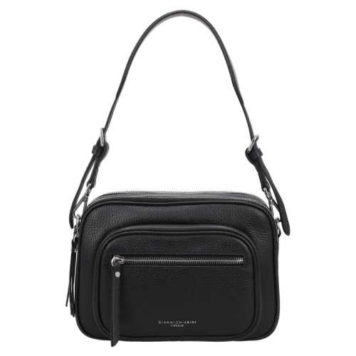 De Gianni Chiarini Carre is een verfijnde crossbodytas in zwart, afgewerkt met zilverkleurige hardware. Het subtiele logo in zilverkleurige letters op de voorkant geeft de tas een moderne en elegante uitstraling.