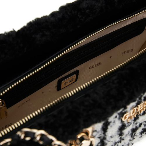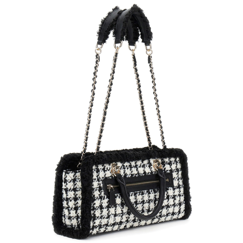 Maak kennis met de Guess Cristi schoudertas, een perfecte combinatie van trendy looks en alledaagse functionaliteit. Deze chique tas, met zijn opvallende zwart-wit geruite patroon, metallic accenten en luxueuze kunstbont rand, voegt een vleugje moderne elegantie toe aan elke outfit.