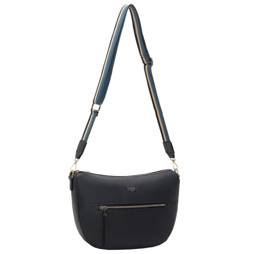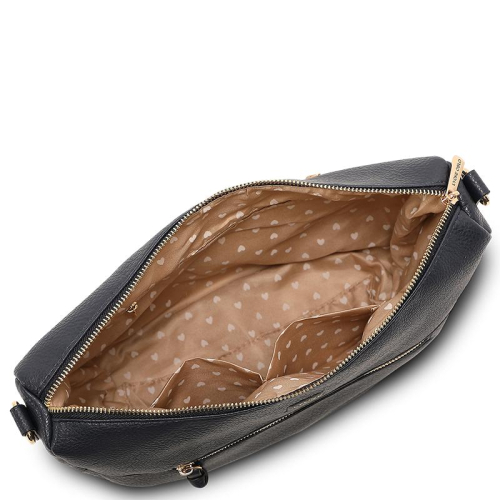 De Lycke Oslo Alma is een stijlvolle crossbodytas uitgevoerd in klassiek blauw, afgewerkt met verfijnde goudkleurige hardware die zorgt voor een elegante uitstraling. De tas wordt geleverd met een opvallende gestreepte schouderband die een speelse touch toevoegt aan het ontwerp. Binnenin is de tas gevoerd met een beige stof, versierd met subtiele witte hartjes.