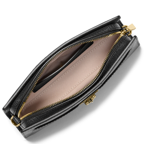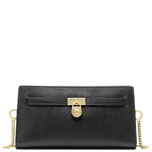Stijlvol, compact en een tikje glamoureus, dat is de Michael Kors Hamilton Moderne crossbodytas waar je naar op zoek bent. Deze verfijnde tas, afkomstig van het prestigeuze merk Michael Kors, een merk dat synoniem staat voor luxe en klassieke elegantie, is een absolute must-have. Gemaakt van 100% echt leer in een tijdloze zwarte kleur, straalt deze crossbodytas pure klasse uit. De goudkleurige hardware, waaronder de schouderband in kettingstijl en een decoratief hangslot vooraan, geven de tas een elegante finishing touch. Een kleine tas, met grote persoonlijkheid.