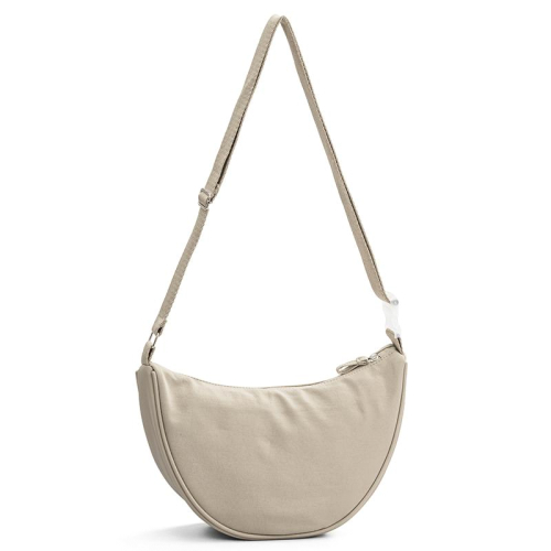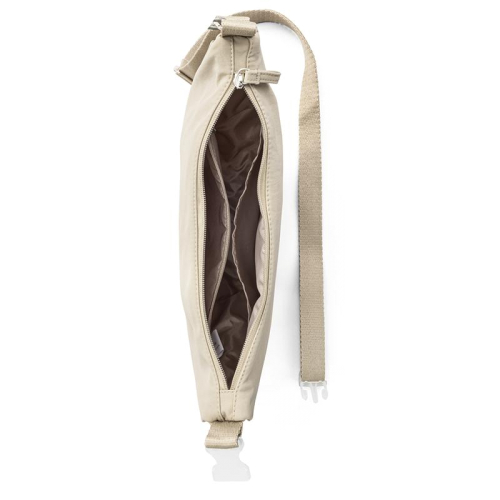 De Puccini Lotta is een crossbodytas in een moderne halve-maanvorm. De tas in het beige is gemaakt van stevig nylon en afgewerkt met zilverkleurige hardware voor een frisse, sportief-chique uitstraling. Op de voorkant is het logo subtiel geëmbossed, een elegant detail dat het ontwerp net dat beetje extra geeft.