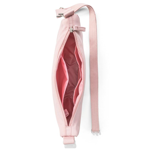 De Puccini Lotta is een crossbodytas in een moderne halve-maanvorm. De tas in het roze is gemaakt van stevig nylon en afgewerkt met zilverkleurige hardware voor een frisse, sportief-chique uitstraling. Op de voorkant is het logo subtiel geëmbossed, een elegant detail dat het ontwerp net dat beetje extra geeft.