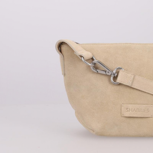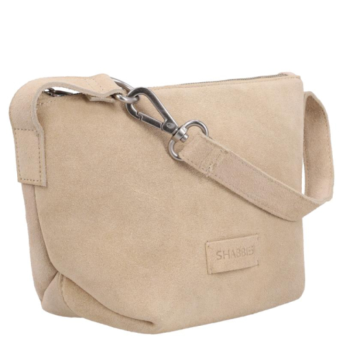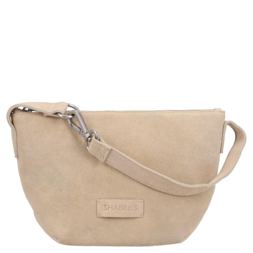 De tas is vervaardigd uit fluweelzacht taupe suède, wat zorgt voor een luxe en verfijnde uitstraling, en is afgewerkt met zilverkleurige hardware. Het merklogo op de voorkant maakt de tas direct herkenbaar als een creatie van Shabbies Amsterdam.