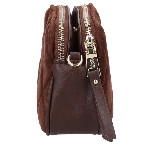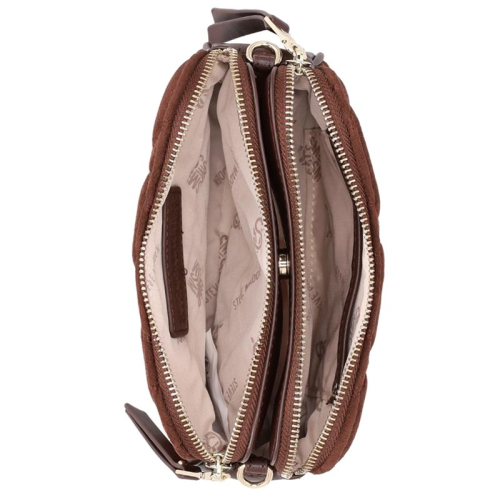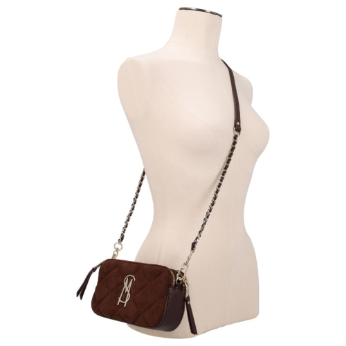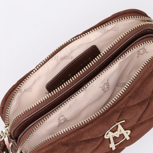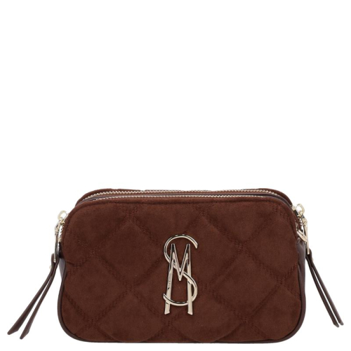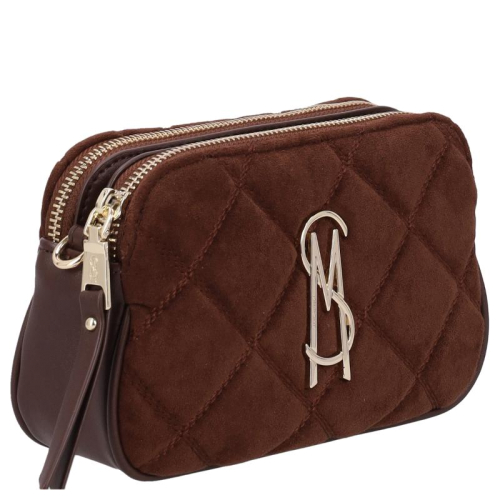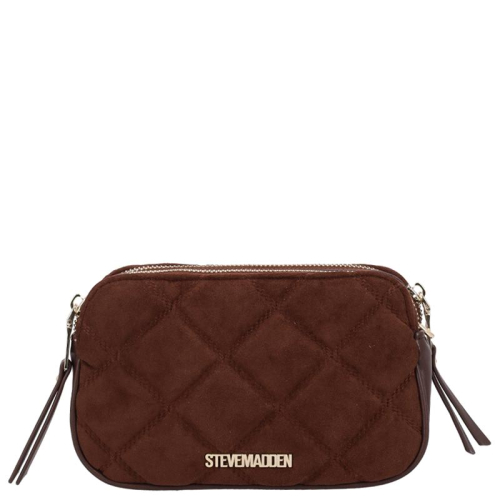 De elegante BmarviS tas van Steve Madden combineert een warme bruine tint met goudkleurige hardware, waaronder het iconische logo op de voorkant. De kunststof suede-look geeft de tas een zachte, luxe uitstraling.
