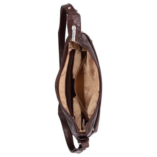 Deze stijlvolle crossbodytas van The Monte is uitgevoerd in hoogwaardig bruin leer en voorzien van subtiele zilverkleurige hardware. Het logo is elegant gedebossed in het leer, wat zorgt voor een verfijnde en tijdloze uitstraling.