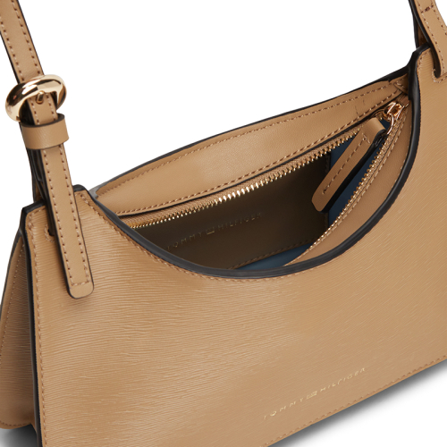De Tommy Hilfiger TH Modern schoudertas in warm beige met stijlvolle zwarte accenten en luxe goudkleurige details is een echte blikvanger! Of je nu casual of chic wilt gaan, deze tas tilt elke outfit naar een hoger niveau.