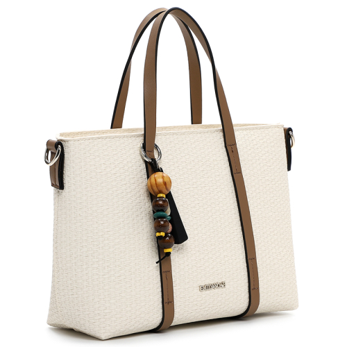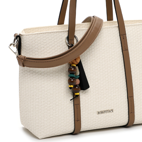 Deze kleine cityshopper van Emily & Noah is een echte blikvanger. Met een elegant embossed rieten geweven dessin in een zachte beige kleur, straalt deze tas klasse en stijl uit. De contrasterende bruine draaghengsels die van de voorkant naar de achterkant lopen, geven een extra vleugje verfijning. Emily & Noah, bekend om hun modieuze ontwerpen, heeft met de Johanna collectie opnieuw een topper op de markt gebracht. En niet te vergeten de bag charm met zomerse kralen geef net dat beetje extra.