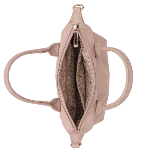 Qua functionaliteit laat de Flora & Co Dani niets te wensen over. De tas heeft één hoofdcompartiment dat wordt afgesloten met een stevige ritssluiting, waardoor je spullen veilig opgeborgen zijn. Binnenin vind je een handig steekvak en ritsvak voor kleinere items. Aan de achterkant van de tas bevindt zich nog een extra ritsvak, ideaal voor spullen die je snel bij de hand wilt hebben. Met metalen stootnoppen aan de onderkant blijft de tas beschermd tegen slijtage.