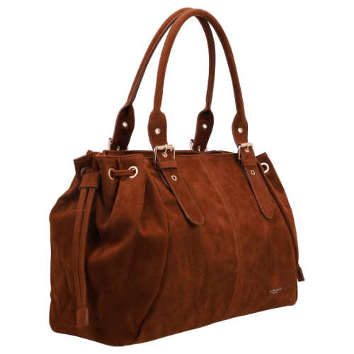 De Flora & Co Camille is een elegante handtas in lichtbruin met suède look. De goudkleurige hardware geeft de tas een verfijnde uitstraling, terwijl het tassenhengsel met buckle zorgt voor een speels en verstelbaar detail.