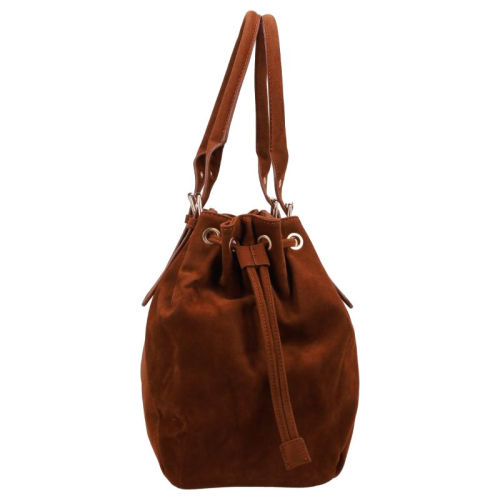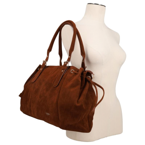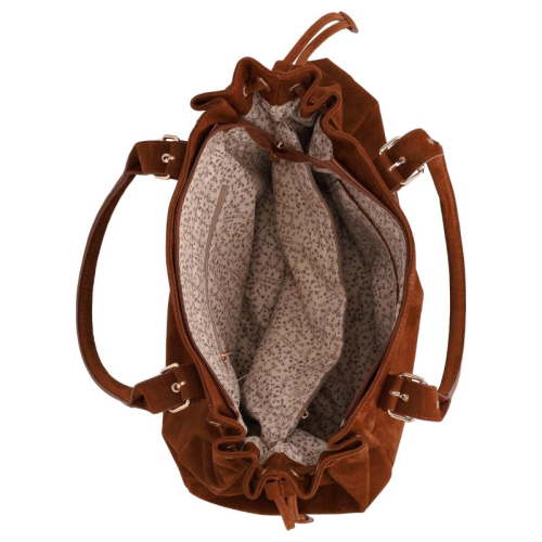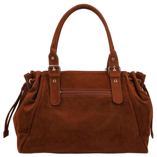 Aan de achterzijde bevindt zich een ritsvak voor snelle toegang tot kleine essentials. Het hoofdcompartiment sluit met een rits en biedt binnenin twee ritsvakken en twee steekvakken. Dankzij de verstelbare stroken aan de zijkanten, eveneens in suède look, kan de tas eenvoudig worden aangepast in grootte.