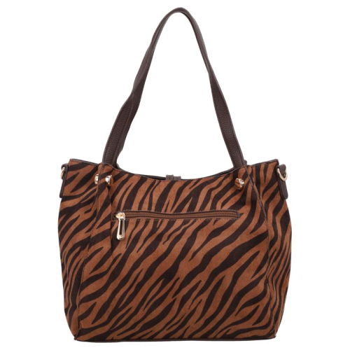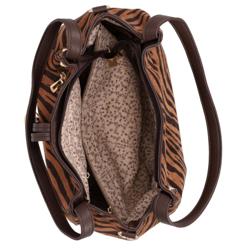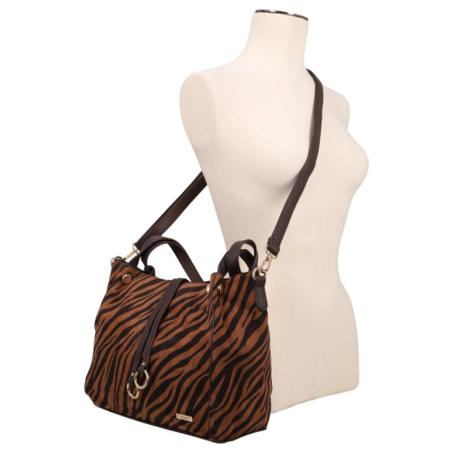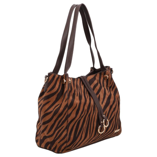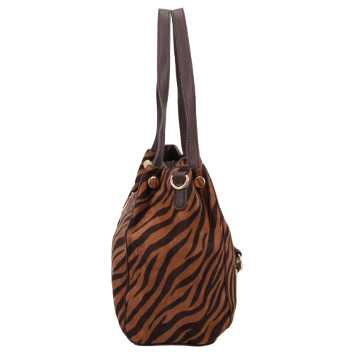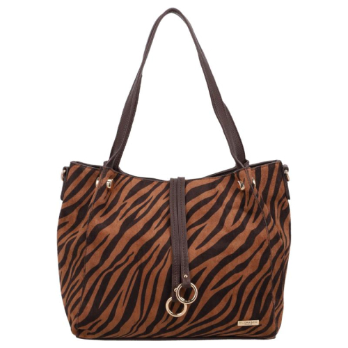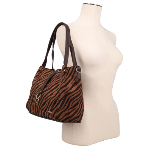 De Flora & Co Chloe is een opvallende handtas met een trendy tijgerprint en een zachte suède look. De goudkleurige hardware voegt een vleugje luxe toe, terwijl het speelse design perfect past bij een gedurfde en elegante stijl.