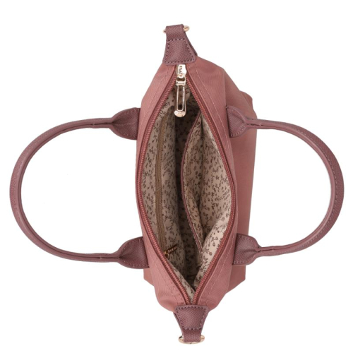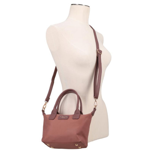 Deze roze tas is een echte blikvanger, gemaakt van glad en bestendig nylon. De glanzende goudkleurige hardware zorgt voor een vleugje luxe, terwijl de kunstleren details op de voorkant en handvatten het geheel een elegant tintje geven. Het silhouet is compact en chic, perfect voor de moderne vrouw die stijl en functionaliteit weet te combineren. Het merk Flora & Co is afkomstig uit Frankrijk en staat bekend om zijn stijlvolle, praktische ontwerpen die een plekje hebben veroverd in de modewereld.