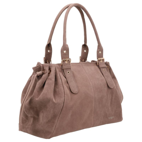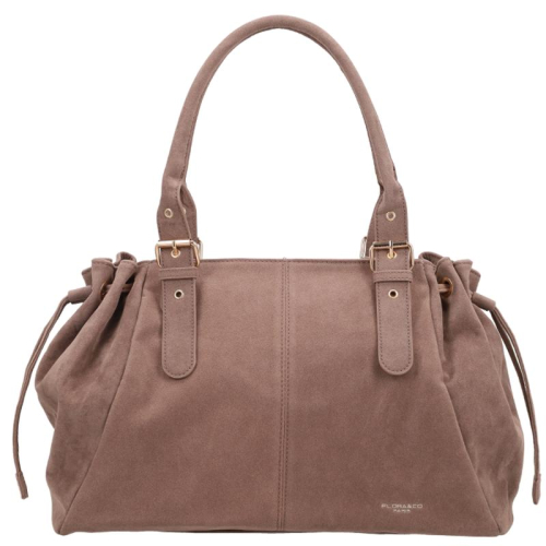 De Flora & Co Camille is een elegante handtas in lichtbruin met suède look. De goudkleurige hardware geeft de tas een verfijnde uitstraling, terwijl het tassenhengsel met buckle zorgt voor een speels en verstelbaar detail.