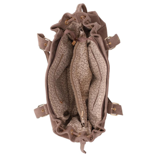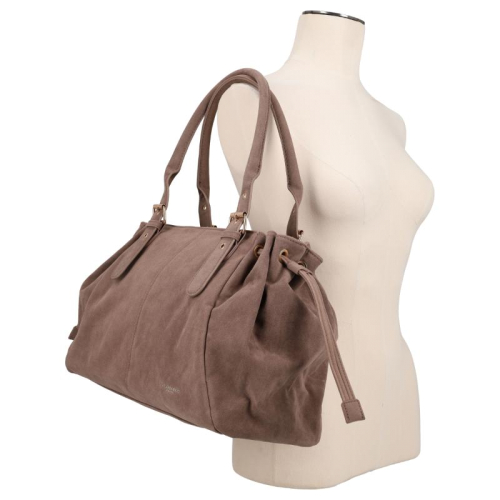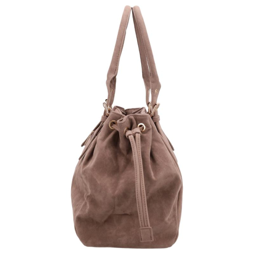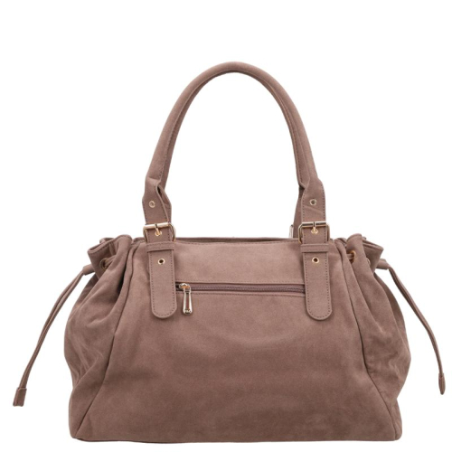 Aan de achterzijde bevindt zich een ritsvak voor snelle toegang tot kleine essentials. Het hoofdcompartiment sluit met een rits en biedt binnenin twee ritsvakken en twee steekvakken. Dankzij de verstelbare stroken aan de zijkanten, eveneens in suède look, kan de tas eenvoudig worden aangepast in grootte.