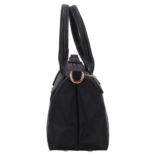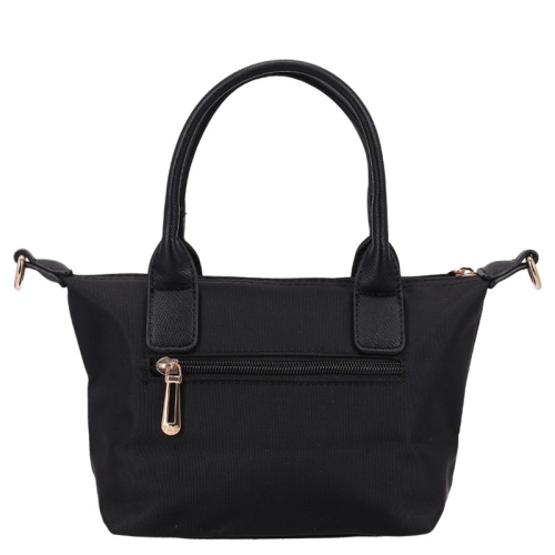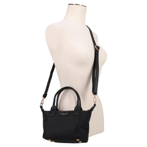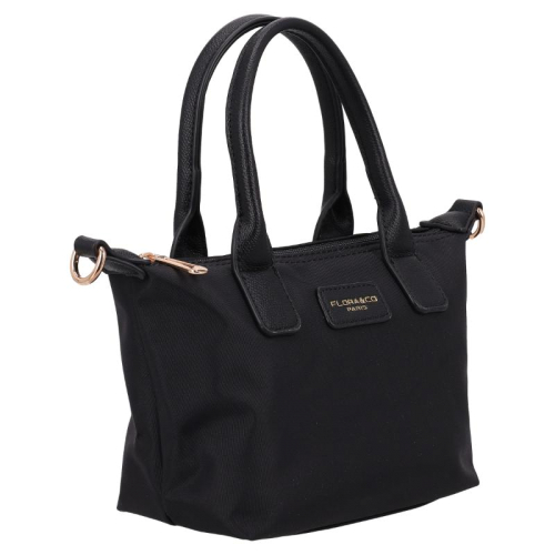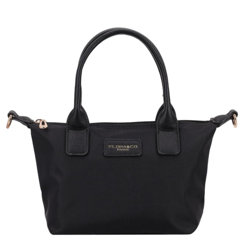 Deze zwarte tas is een echte blikvanger, gemaakt van glad en bestendig nylon. De glanzende goudkleurige hardware zorgt voor een vleugje luxe, terwijl de kunstleren details op de voorkant en handvatten het geheel een elegant tintje geven. Het silhouet is compact en chic, perfect voor de moderne vrouw die stijl en functionaliteit weet te combineren. Het merk Flora & Co is afkomstig uit Frankrijk en staat bekend om zijn stijlvolle, praktische ontwerpen die een plekje hebben veroverd in de modewereld.