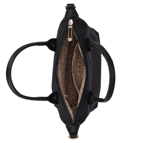 Qua functionaliteit laat de Flora & Co Dani niets te wensen over. De tas heeft één hoofdcompartiment dat wordt afgesloten met een stevige ritssluiting, waardoor je spullen veilig opgeborgen zijn. Binnenin vind je een handig steekvak en ritsvak voor kleinere items. Aan de achterkant van de tas bevindt zich nog een extra ritsvak, ideaal voor spullen die je snel bij de hand wilt hebben. Met metalen stootnoppen aan de onderkant blijft de tas beschermd tegen slijtage.