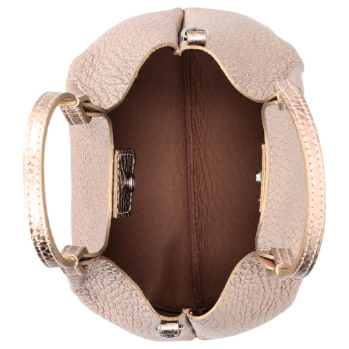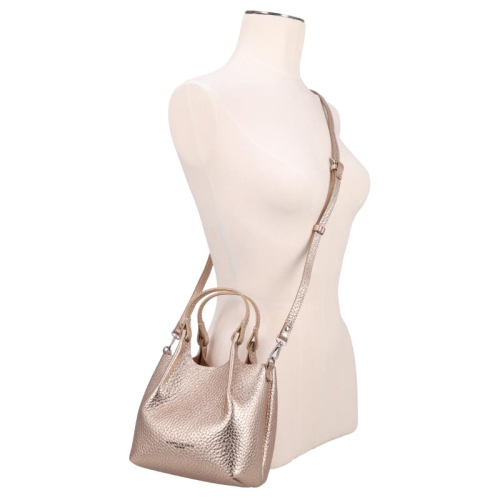 De Gianni Chiarini Dua handtas in brons straalt een moderne elegantie uit. Het leer wordt verfijnd afgewerkt met zilverkleurige hardware, wat de tas een luxe uitstraling geeft. De handvatten zijn subtiel geïntegreerd in de plooien die in het ontwerp van de tas zijn gevormd, waardoor een speels detail ontstaat.