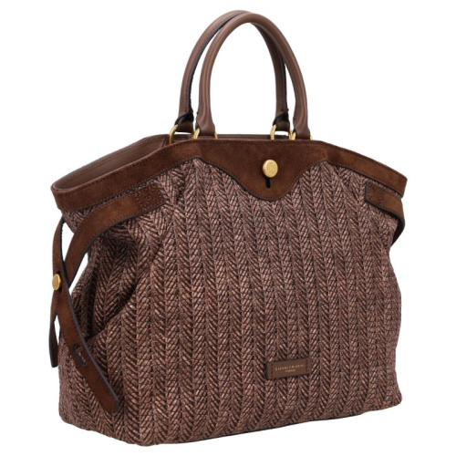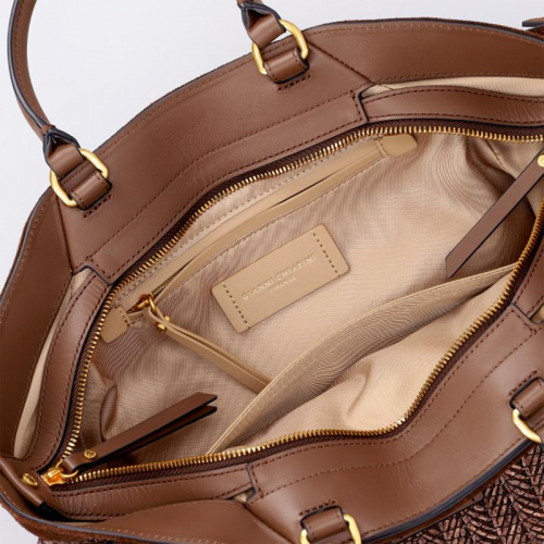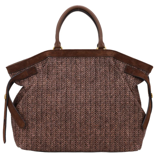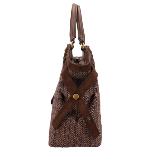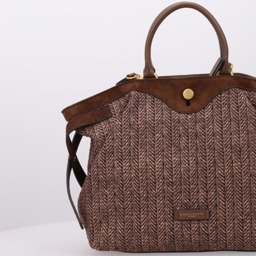 De Gianni Chiarini Claudette is een stijlvolle handtas in bruin rotan, afgewerkt met goudkleurige hardware. Het natuurlijke materiaal en de verfijnde details geven de tas een chique uitstraling.